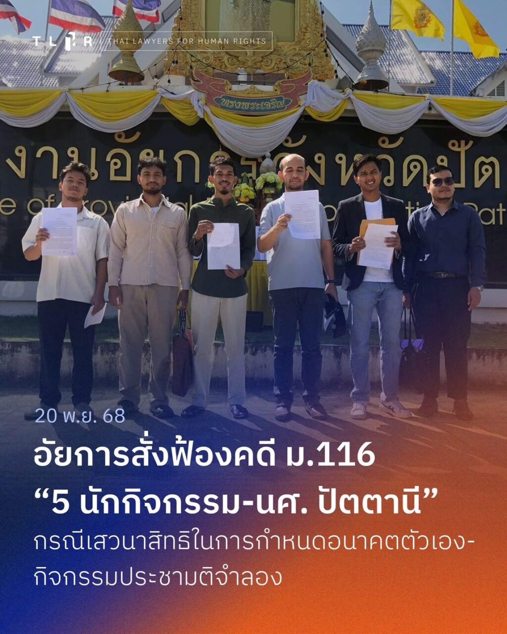 วันที่ 20 พ.ย. 2568 ที่ศาลจังหวัดปัตตานี พนักงานอัยการภาค 9 ได้ยื่นฟ้องคดีของนักกิจกรรมและนักศึกษาจำนวน 5 คน ในข้อหาหลักตามประมวลกฎหมายอาญามาตรา 116 กรณีถูกกล่าวหาจากกิจกรรมทำประชามติจำลอง ระหว่างงานเสวนาเรื่อง “สิทธิในการกำหนดอนาคตตนเองกับสันติภาพปาตานี” ที่มหาวิทยาลัยสงขลานครินทร์ วิทยาเขตปัตตานี เมื่อวันที่ 7 มิ.ย. 2566 โดยศาลให้ประกันตัวทั้งห้าคนในระหว่างพิจารณา