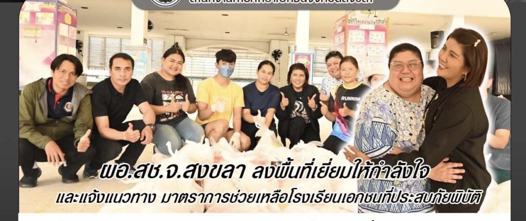 การสนับสนุนจากองค์กรภายนอก (3-4 ธ.ค. 68): สช. สงขลา ได้รับมอบถุงยังชีพจำนวน 1,138 ถุง และข้าวสารรวม 1,400 กิโลกรัม พร้อมอุปกรณ์ทำความสะอาด จากมูลนิธิ “เพจอีจัน” เพื่อส่งต่อไปยังโรงเรียนเอกชนที่ได้รับผลกระทบรวมกว่า 8 แห่ง เช่น หาดใหญ่วิทยาคาร, ส่งเสริมศาสนาวิทยามูลนิธิ, และธรรมศึกษามูลนิธิ โดยมีการนำไปแจกจ่ายและเยี่ยมโรงเรียนต่าง ๆ อย่างรวดเร็ว