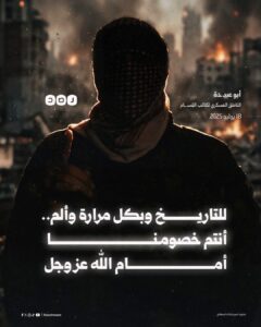 ตลอด 20 ปี ตัวตนของเขาถูกปิดบังไว้ภายใต้ผ้ากุฟิยะห์ ทำหน้าที่เป็นโฆษกกองพันอัล-กัสซาม จนกระทั่งคำแถลงสุดท้ายของเขาเมื่อวันที่ 18 กรกฎาคม 2025 ได้กลายเป็นมรดกชิ้นสุดท้ายที่เขาทิ้งไว้ให้โลก อบูอุบัยดะห์ยืนยันยุทธศาสตร์การรบที่ยืดเยื้อเพื่อปกป้องอัลอักซอ และได้ทิ้งประโยคที่ทำให้นักฉวยโอกาสและผู้เพิกเฉยต้องสะดุ้งว่า: