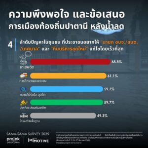 ผลสำรวจนี้เปรียบเสมือน “สาร” ที่ส่งตรงถึงพรรคการเมืองทุกระดับ ความพึงพอใจที่ต่ำต่อการจัดการน้ำท่วมและความต้องการกวาดล้างยาเสพติด (68.8%) แสดงให้เห็นว่าปัญหาปากท้องและความปลอดภัยคือ “ความจริงพื้นฐาน” ที่ประชาชนต้องการ ไม่ใช่เพียงวาทกรรมทางการเมืองเรื่องความมั่นคงแบบเดิมๆ