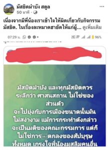 สตูล – 30 ธันวาคม 2568 มัสยิดมำบัง (มัสยิดกลางจังหวัดสตูล) ได้ชี้แจงผ่านเพจมัสยิด สยบดราม่าโซเชียล ยืนยันจุดยืนความเป็นกลางทางการเมือง หลังถูกวิจารณ์กรณีเปิดพื้นที่ให้ผู้สมัคร ส.ส. มุสลิมประกอบพิธีละหมาดฮายัด ย้ำชัดมัสยิดคือพื้นที่สาธารณะที่เปิดกว้างสำหรับมุสลิมทุกคน ขณะที่นักวิชาการเตือนสติ “อย่าใช้ความศักดิ์สิทธิ์ของศาสนาเป็นยี่ห้อสินค้าทางการเมือง”