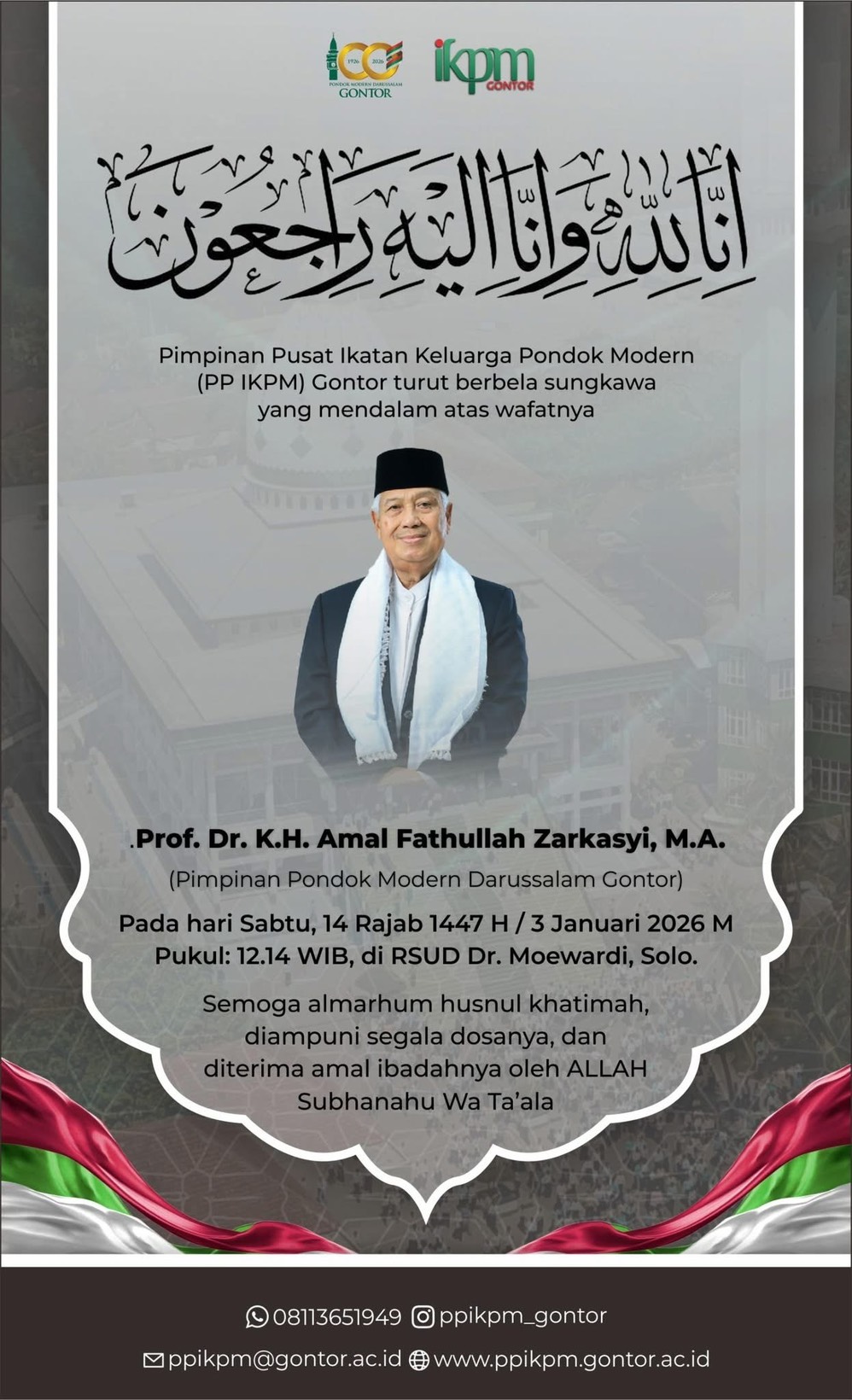[3 มกราคม 2569] – วงการศึกษาอิสลามโลกและศิษย์เก่ากอนตอร์ทั้งในอินโดนีเซียและไทย ต่างร่วมไว้อาลัยต่อการจากไปของ ศาสตราจารย์ ดร. เค.เอช. อะมัล ฟัตฮุลลอฮ์ ซัรกัสชี (Prof. Dr. K.H. Amal Fathullah Zarkasyi, M.A.) ผู้นำสูงสุดแห่งสถาบัน Pondok Modern Darussalam Gontor ซึ่งถึงแก่กรรมอย่างสงบ ณ โรงพยาบาล Dr. Moewardi เมืองโซโล เมื่อเวลา 12.14 น. (เวลาอินโดนีเซีย)