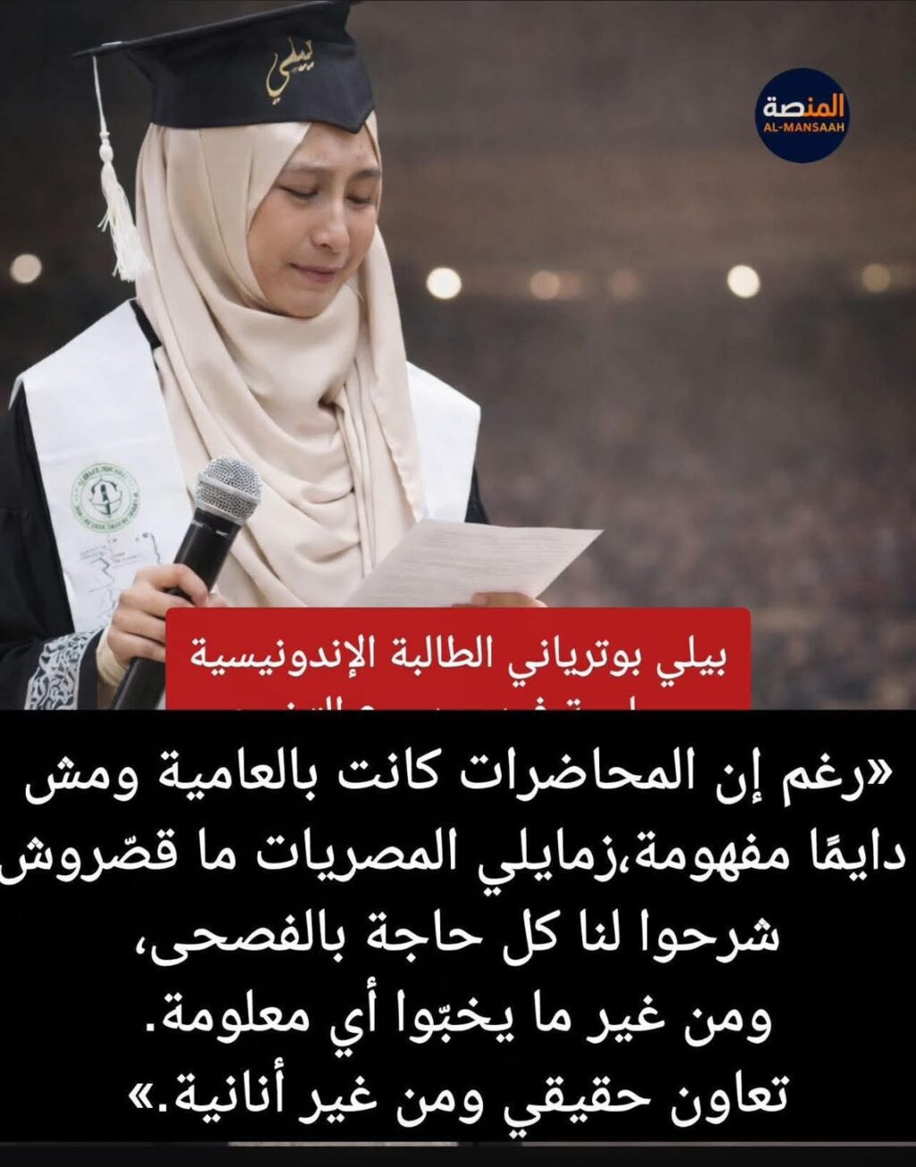 จุดที่ทำให้เธอกลายเป็นไวรัลไปทั่วโลกมุสลิม อาเซียน และไทย คือวันที่เธอได้รับเลือกเป็นตัวแทนบัณฑิตขึ้นกล่าวสุนทรพจน์ ความเป็นธรรมชาติ ความกตัญญูที่ส่งผ่านน้ำตา และการยกย่องมิตรภาพจากเพื่อนชาวอียิปต์ ทำให้ใจความสำคัญของ “ความรู้ คู่คุณธรรม” ถูกส่งต่อไปยังคนรุ่นใหม่ทั่วโลกอย่างทรงพลัง