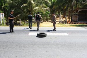 ในที่เกิดเหตุ เจ้าหน้าที่พบป้ายผ้าเขียนข้อความเชิงสัญลักษณ์เกี่ยวกับการปลดปล่อยปัตตานี แขวนอยู่ริมถนน และใกล้กันพบวัตถุต้องสงสัยวางอยู่ เจ้าหน้าที่ต้องเร่งปิดการจราจรเพื่อความปลอดภัย ก่อนจะใช้ “ระเบิดน้ำ” ทำลายเพื่อตัดวงจร