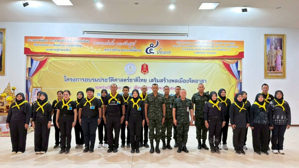 เมื่อเวลา 10.00 น. ของวันที่ 23 ก.พ.69 นายกฤษณนันท์ กำไร รองผู้ว่าราชการจังหวัดนราธิวาส เป็นประธานเปิดโครงการอบรมประวัติศาสตร์ชาติไทย เสริมสร้างพลเมืองจิตอาสา ณ ห้องประชุมสโมสรนายทหารสัญญาบัตร กรมทหารราบที่ 151 ค่ายกัลยาณิวัฒนา อำเภอเมืองนราธิวาส พร้อมบรรยายพิเศษ ในหัวข้อ “ความสำคัญของประวัติศาสตร์ชาติไทยต่อการสร้างความสามัคคี ความมั่นคง และการอยู่ร่วมกันอย่างสันติในสังคมพหุวัฒนธรรม” โดยมีกลุ่มเป้าหมายทหารกองประจำการหลักสูตรการศึกษานอกระบบ กรมทหารราบที่ 151 ซึ่งเป็นนักศึกษาของ สกร.อำเภอเมืองนราธิวาส เข้าร่วมโครงการอบรมในครั้งนี้ จำนวน 200 คน