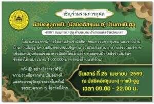 จึงได้กำหนดจัดงาน “ดื่มน้ำชาการกุศล” ในวันเสาร์ที่ 25 เม.ย. 2569 เพื่อหารายได้สมทบทุนซ่อมแซมอาคารมัสยิด พร้อมเปิดโอกาสให้ทุกภาคส่วน ทั้งหน่วยงานภาครัฐ ภาคเอกชน และพี่น้องประชาชนผู้มีจิตศรัทธา ได้มีส่วนร่วมในการสนับสนุน